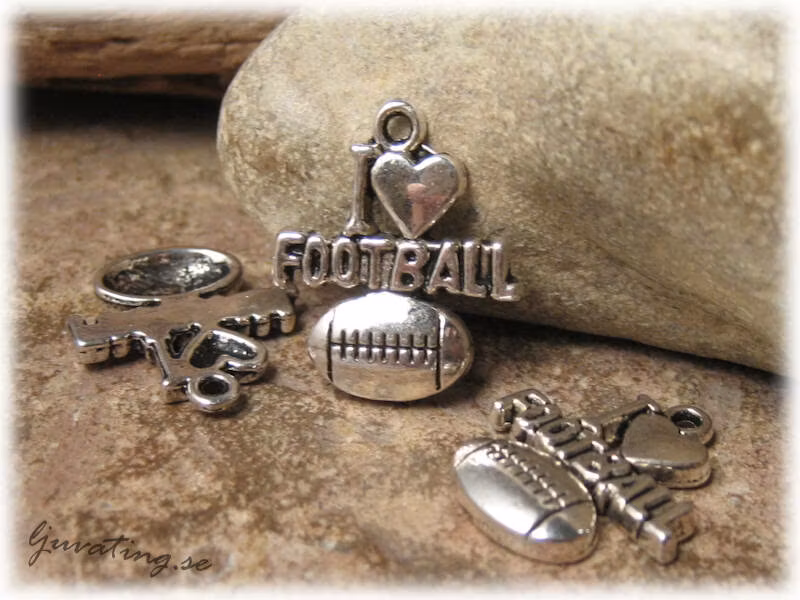 Mått: ca 20x18 mm.Hål: ca 1,5 mm. Berlock i metall med text I love Football. Inget motiv på baksidan, se bild.. Vikt och prisangivelse avser 1 styck. Nickel, bly och kadmiumsäkrad av leverantören enligt EU:s regler.