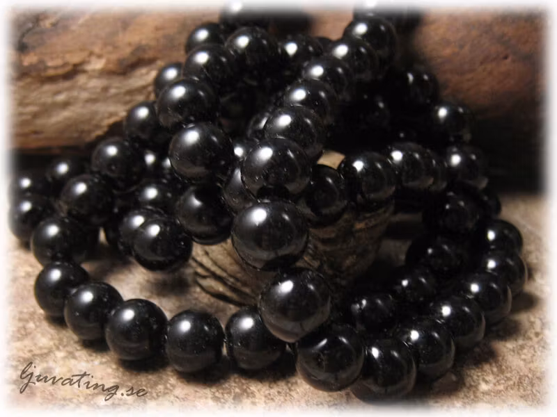 Mått: ca 10 mm. Hål: ca 1,4 mm. En rund lackad glaspärla i matt svart färg. Pärlorna är lackade på sträng och det kan på några pärlor finnas lite överskottsfärg kvar vid hålen, som Du får "pilla" bort. De levereras ej på sträng som bilden visar utan lösa i Ziplockpåse. Viktangivelse och pris avser 20 stycken pärlor.Ursprung: Kina