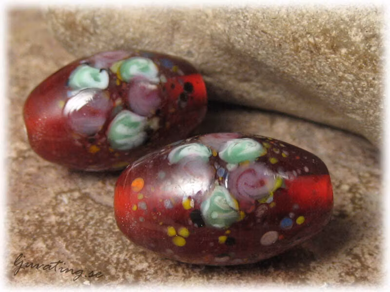 Lampwork transparent röd oval med blommor ca 23x14 mm