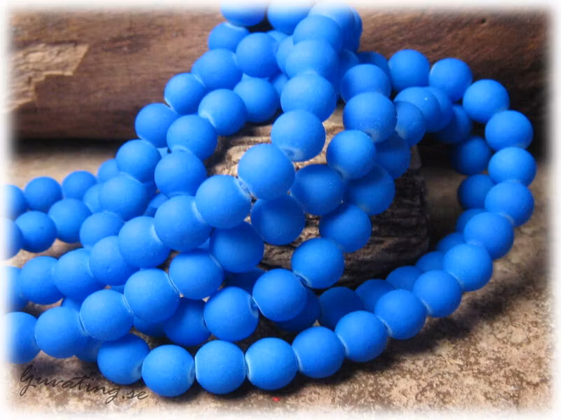 Mått: ca 6 mm. Hål: ca 1 mm. Läckra blåa runda glaspärlor med överdrag liknande gummimaterial. Pris och viktangivelse avser 30 styck pärlor. De levereras inte på sträng som bilden visar utan lösa i ziplock påse.Ursprung: Kina
