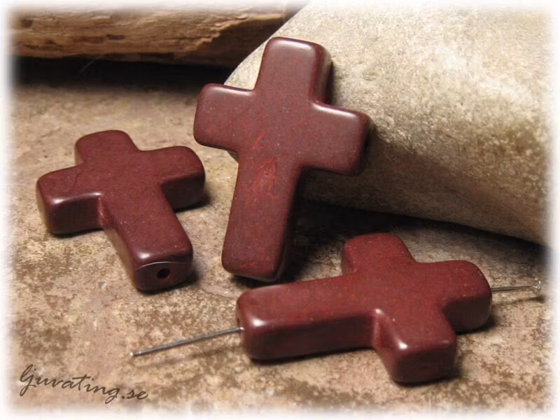 Mått: ca 30x22 mm. Tjocklek: ca 6 mm. Hål: ca 1,5 mm. Kors i howlite brunt med inslag av meleringar i färgen. Hålet går lodrätt, se hattpinnens placering. Vikt och prisangivelse avser 1 styck kors.