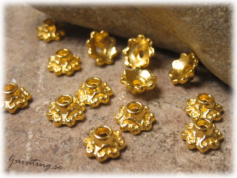 Mått: ca 7 mm.Höjd: ca 3 mm.Hål: ca 1,3 mm. Pärlhatt i ljus guldfärgad metall. Vikt och prisangivelse avser 20 stycken.Nickel, bly och kadmiumsäkrad av leverantören