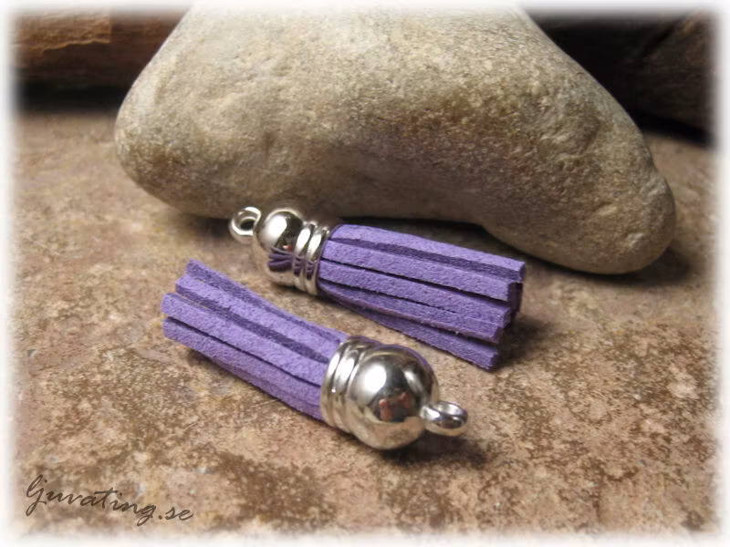 Mått: ca 30 mm. Hålet: ca 2,0 mm. Litet hänge tofs i lila fuskmocka och med silverfärgad hatt. Vikt och prisangivelse avser 1 styck tofs. Nickel, bly och kadmiumsäkrad av leverantören.
